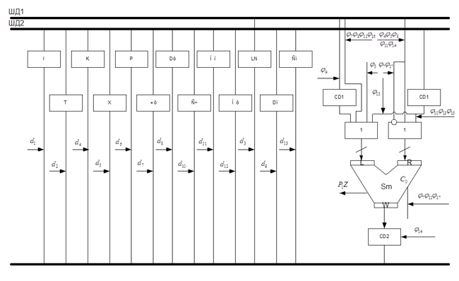 В структуре М-автомата использованы две шины данных ШД1 и ШД2. Они соединены с входами АЛУ А1 и А2 соответственно. Разделим множество операндов АЛУ на два подмножества исходя из условий.