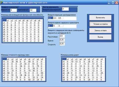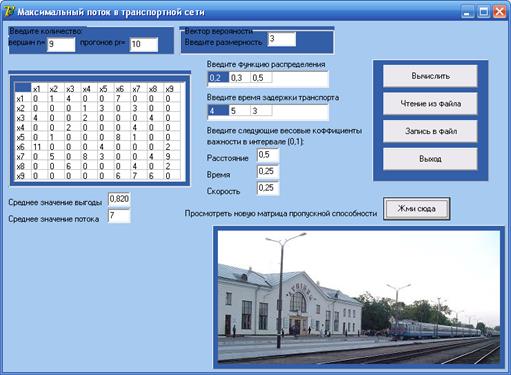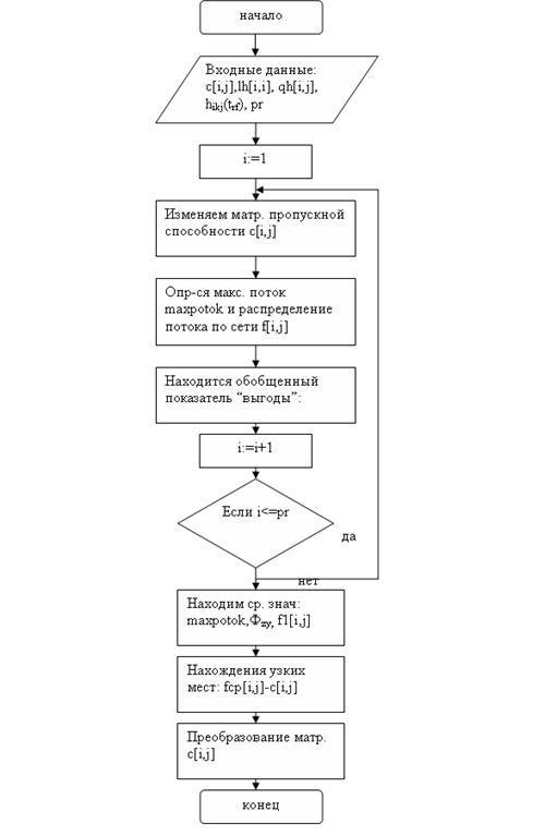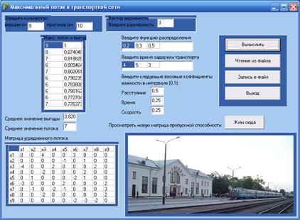 Наличие внутренних транспортных потоков в Gh обусловливает вероятностный характер пропускных способностей на многих ветвях графа Gh . Недетерминированное время формирования и расформирования составов влияет случайным образом на время передвижения транзитных составов из пункта отправления в пункт назначения по пути, содержащим этот узел. Указанные особенности не позволяют использовать для поиска максимального потока в сети алгоритм Форда-Фалкерсона. Поэтому актуально использование имитационной модели, основанной на сочетании процедуры Монте-Карло и теоремы Форда-Фалкерсона. Таким образом, ставятся задачи определения с помощью имитационной модели максимального потока в заданном направлении между множеством узлов входов в сеть и множеством узлов выходов, а так же поиска узких мест в сети Gh при перемещении транспорта в заданном направлении, устранение которых позволит достичь оптимальной организации потоков в сети. При поиске интегрального максимального потока в сети необходимо выполнение следующих условий: для каждого сочетания входа и выхода имеется максимальный поток, интегральная функция затрат имеет минимальное значение.