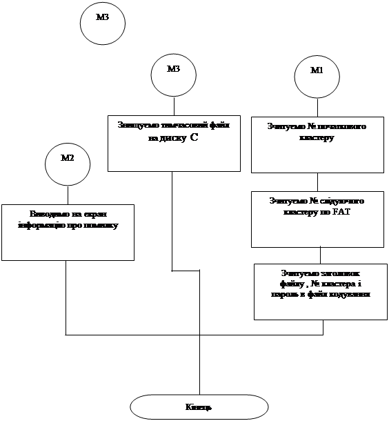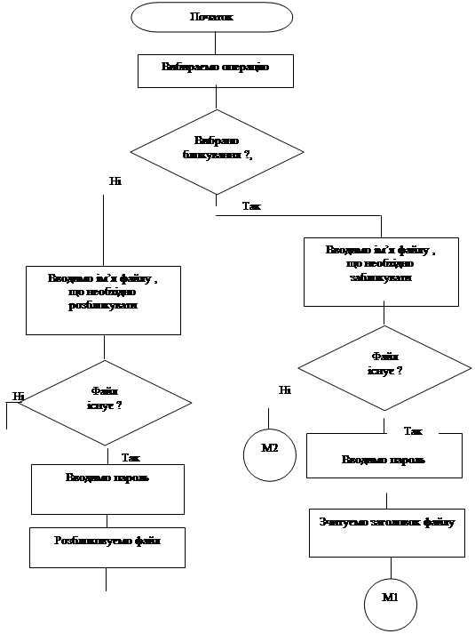 Після того, як користувач запустить програму і введе ім’я файлу (File. Txt), що необхідно захистити від запису, програма відкриє цей файл, і витягне з нього один кластер. Місце, де знаходився цей кластер буде помічене як БЕД - блок. Потім програма створить файл на жорсткому диску (File_), в який буде занесено номер кластеру і пароль (пароль користувач повинно ввести в процесі роботи програми). Створивши такий файл програма закінчує свою роботу. Після цього файл на гнучкому диску не можна ні прочитати, ні скопіювати, ні знищити. Цей алгоритм програми дозволяє захистити файл від несанкціонованого копіювання на інший диск. Навіть коли дискету буде втрачено без наявності файлу File_ не можна надати файлу попереднього вигляду.