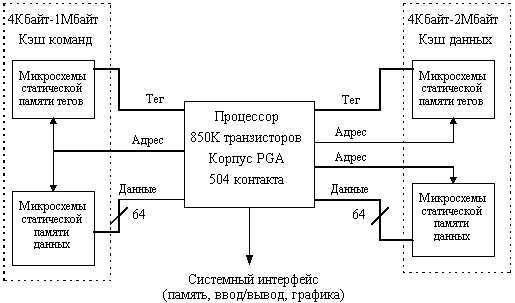 однотактным временем ожидания. Внешняя кэш-память данных построена по принципу прямого отображения. Кроме того, для повышения эффективности на кристалле процессора реализован небольшой вспомогательный кэш емкостью в 64 строки. Формирование, преобразование адреса и обращение к основной и вспомогательной кэш-памяти данных выполняется на двух ступенях конвейера. Максимальная задержка при обнаружении попадания равна одному такту. Вспомогательный внутренний кэш содержит 64 32-байтовые строки. При обращении к кэш-памяти осуществляется проверка 65 тегов: 64-х тегов вспомогательного кэша и одного тега внешнего кэша данных. При обнаружении совпадения данные направляются в требуемое функциональное устройство. При отсутствии необходимой строки в кэш-памяти производится ее загрузка из основной памяти. При этом строка поступает во вспомогательный кэш, что в ряде случаев позволяет сократить количество перезагрузок внешней кэш-памяти, организованной по принципу прямого отображения. Архитектурой нового процессора для команд загрузки/записи предусмотрено кодирование специального признака локального размещения данных ("spatial locality only"). При выполнении команд загрузки, помеченных этим признаком, происходит обычное заполнение строки вспомогательного кэша. Однако последующая запись строки осуществляется непосредственно в основную память минуя внешний кэш данных, что значительно повышает эффективность работы с большими массивами данных, для которых размера строки кэш-памяти с прямым отображением оказывается недостаточно. Расширенный набор команд процессора позволяет реализовать средства автоиндексации для повышения эффективности работы с массивами, а также осуществлять предварительную выборку команд, которые помещаются во вспомогательный внутренний кэш. Этот вспомогательный кэш обеспечивает динамическое расширение степени ассоциативности основной кэш-памяти, построенной на принципе прямого отображения, и является более простым альтернативным решением по сравнению с множественно-ассоциативной организацией. Процессор PA 7200 включает интерфейс новой 64-битовой мультиплексной системной шины Runway, реализующей расщепление транзакций и поддержку протокола когерентности памяти. Этот интерфейс включает буфера транзакций, схемы арбитража и схемы управления соотношениями внешних и внутренних тактовых частот. |