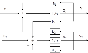 В данной лабораторной работе средствами пакета Matlab (c использованием его расширения – пакета моделирования динамических систем Simulink) должно быть выполнено моделирование линейной системы, зафиксированы процессы, соответствующие элементам матричной весовой и переходной функций и проведено их сравнение с аналитически полученными зависимостями. Структурная схема системы представлена на рис. 1.1, коэффициенты структурной схемы - в табл. 1.1. Номер варианта для бригады указывается преподавателем.