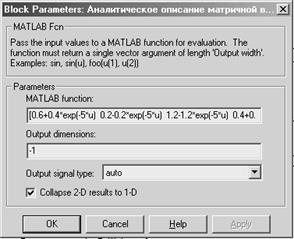 Рис. 1.8. Настройки блока MatlabFcn, содержащего аналитическое описание элементов матричной весовой функции