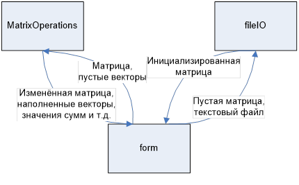 form – форма приложения, процедуры обмена данными между массивами и элементами формы. Структура связей модулей такова: