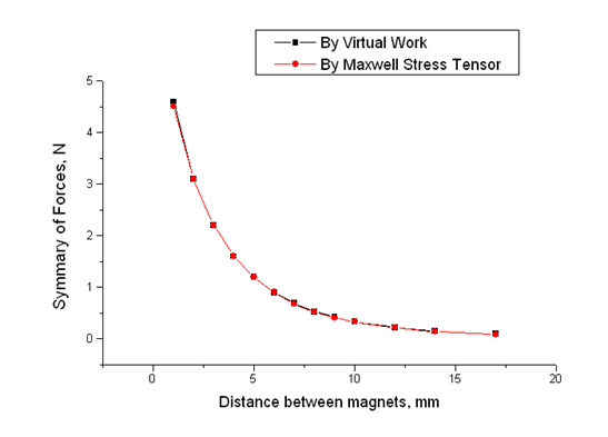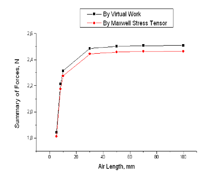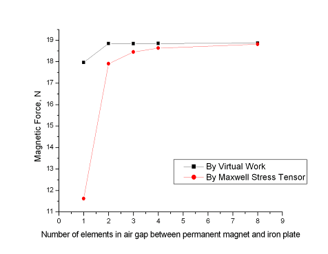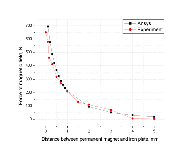 Разработана и собрана экспериментальная установка, из двух постоянных магнитов, для проведения измерений силы магнитного поля на один из магнитов в зависимости от величины зазора. Созданы различные конечно-элементные модели в программной системе конечно-элементного анализа ANSYS для расчета силы магнитного поля на один из постоянных магнитов. Исследована сходимость методов расчета в ANSYS в зависимости от величины воздушного слоя, окружающего систему и количества элементов модели. Проведено сравнение экспериментальных и расчетных результатов.