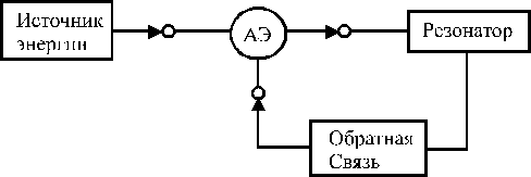 Для выполнения последнего условия достаточно периодически добавлять в резонатор порции электромагнитной энергии синхронно с возбуждаемыми колебаниями. Источником энергии может служить постоянное электрическое поле; для преобразования его энергии в энергию колебаний требуется активный элемент (АЭ). Структурная схема автогенератора изображена на рисунке 1.1. Обратная связь здесь нужна для синхронизации работы АЭ колебаниями, существующими в резонаторе.