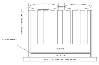 Пассивное представляет собой просто радиатор, прислоненный на поверхность кристалла и прикрепленный к «сокету» или «слоту». Уже давно не применяется для охлаждения большинства CPU, иногда ставится на GPU и активно используется для охлаждения модулей RAM, видеопамяти и чипсетов. Такое охлаждение основывается на естественной конвекции воздуха. Радиатор должен быть желательно медным (лучше отводит тепло, чем алюминиевый) и игольчатым (без заострений на конце иголок). Главное – общая площадь его поверхности. Чем она больше, тем эффективнее теплоотвод. Подошва радиатора должна быть гладкой, иначе контакт с чипом (а, следовательно, и теплопередача) будет нарушен. Всем радиаторам присуща такая характеристика, как температурное сопротивление. Оно показывает, насколько изменится температура процессора при увеличении потребляемой им мощности на 1 Ватт. Чем это сопротивление меньше, тем лучше. Радиаторы монтируются к чипу либо специальным креплением (к разъему процессора), либо приклеиваются термоклеем (на чипы памяти, чипсет). В первом случае на поверхность процессора нужно сначала тонким слоем нанести термопасту (создать термоинтерфейс). Самые распростряненные термопасты – КПТ-8 и АлСил.