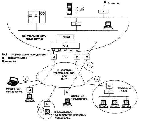 В связи с широким использованием на предприятиях локальных сетей наиболее часто встречающийся вид удаленного доступа — это доступ не к отдельному компьютеру, а к сети в целом. Для этой цели в центральной сети предприятия устанавливается специальная система — сервер удаленного доступа (Remote Access Server, RAS), который выполняет большой спектр функций по обслуживанию многочисленных удаленных клиентов. Задачи сервера удаленного доступа, который часто называют также коммуникационным сервером, зависят от схемы удаленного доступа.