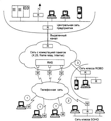 Удаленные пользователи подключаются к специальному устройству центральной сети - серверу удаленного доступа (RAS), которое работает в режиме маршрутизатора или шлюза в зависимости от протоколов, используемых удаленным пользователем.