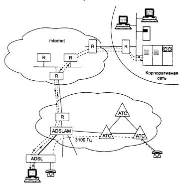 Маршрутизатор, расположенный в здании АТС, должен соединяться выделенным высокоскоростным каналом с другим маршрутизатором Internet (или другой сети с коммутацией пакетов). Если центральная сеть предприятия подключена к Internet через выделенный высокоскоростной канал, то все удаленные пользователи, у которых установлены модемы ADSL, получают высокоскоростной доступ к сети своего предприятия на тех же телефонных каналах, которые всегда соединяли их с городской АТС.