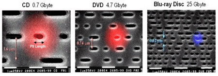 Оптические носители нового поколения объединяет только стандартный размер диска и сине-фиолетовый (а вовсе не голубой, как считает абсолютное большинство русскоязычных пользователей) лазер с длиной волны 405 нм. Переход на более коротковолновый лазер позволяет значительно плотнее размещать информацию на диске, уместив на один слой до 27 Гбайт данных.