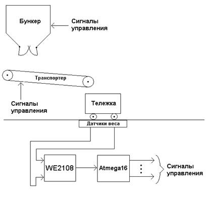 Система измерения веса построена на весовом индикаторе WE2108, который является измерительным усилителем для подключения 4х датчиков веса. Сигнал датчиков веса усиливается и преобразуется прибором в цифровую форму и отображается на встроенном дисплее. Управление системой в целом осуществляется микроконтроллером ATmega16, который принимает от WE2108 сигнал превышения заданного уровня срабатывания и выдает соответствующие сигналы управления задвижками бункера и транспортером.