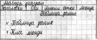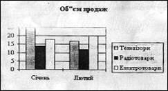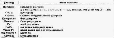 Так, якщо вони розміщені по рядках, то рядів даних – 3 (Телевізори, Радіоприймачі, Магнітофони), а категорій – 2 (Січень, Лютий). Якщо ряди даних розміщені по колонках, то рядів даних – 2 (Січень, Лютий), а категорій – 3 (Телевізори, Радіоприймачі, Магнітофони). Діаграма має ряд елементів, які наведені в таблиці.