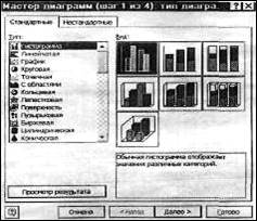 Діалогове вікно, що виводиться на екран на цьому етапі, має дві вкладки: Стандартні та Нестандартні типи діаграм.