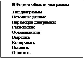 До меню області діаграми входить команда Формат области диаграммы і 4 команди, які реалізують функції Мастера диаграмм. Наприклад, за командою Тип диаграмм на екран викликається однойменне вікно, аналогічне вікну „Майстра диаграмм”. Змінюючи тип діаграми, можна досягти найефективнішого зображення на екрані.