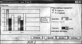 У цьому самому вікні виводиться зразок створюваної діаграми, щоб можна було бачити, як зміна параметрів у вікні майстра відобразиться на готовій діаграмі. У нашому випадку всі параметри, що замовчуються, підходять. Задля цікавості поверніться на вкладку Диапазон данных і виберіть варіант розташування Ряды в: ○ столбцах. Подивіться, як змінився зразок. Перейдіть на вкладку Ряд і подивіться, як змінилися імена рядів, їх значення і підписи по осі Х . Поверніться на вкладку Діапазон і знову встановіть перемикач у стан Ряды в: ○ строках: