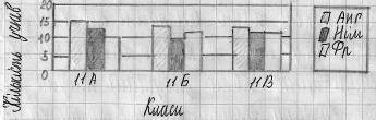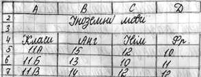 Для відображення даних про чисельність підгруп у кожному класі зручно вибирати стовпчикову діаграму (гістограму). Категоріями тут будуть класи – 11А, 11Б, 11В. Ряди розташовано по стовпцях. Імена рядів – Анг., Нім. і Фр.