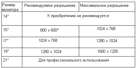 Для электронно-лучевых (CRT) мониторов существуют свои характеристики, которые либо улучшают работу с компьютером, либо ухудшают ее. Одной из основных характеристик такого монитора является частота обновления экрана. Для электронно-лучевых мониторов достаточной частотой обновления экрана считается 85Гц. Эта величина показывает сколько раз в секунду будет обновляться картинка на экране. Если эта скорость маленькая, то глаза начинают улавливать мерцание экрана и из-за этого быстро устают. Самой лучшей частотой обновления экрана считается 100Гц, если она больше, то человеческий глаз уже не воспринимает разницы между 100Гц и 200Гц. Еще для работы с компьютером очень важно разрешение экрана. Ведь если разрешение слишком мало, то значки на экране очень большие и не умещаются на дисплее, а если слишком большое разрешение, то иконки и знаки слишком маленькие. Из-за этого глаза быстро устают. Ниже приводится таблица рекомендуемых и максимальных разрешений.