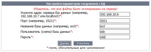 Для работы с СДО необходимо ее проинсталлировать. Процесс инсталляции не вызывает затруднений. Вначале следует указать параметры соединения с базой данных (рисунок 2.5.1.1).