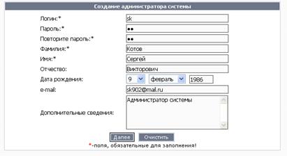 После того, как были установлены параметры соединения, и база данных была успешно развернута, следует создать администратора системы (рисунок 2.5.1.2).