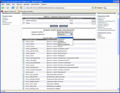 Начинать работу с СДО следует с заполнения основных справочников. Для этого войдя на главную страницу, необходимо пройти идентификацию. Процесс идентификации показан на рисунке 2.5.2.1. Заполнение справочников осуществляют, как администраторы, так и секретари факультетов и кафедр. Поэтому администратору следует создать новые группы пользователей, которые будут заполнять систему. Создание группы пользователей показано на рисунке 2.5.2.2.