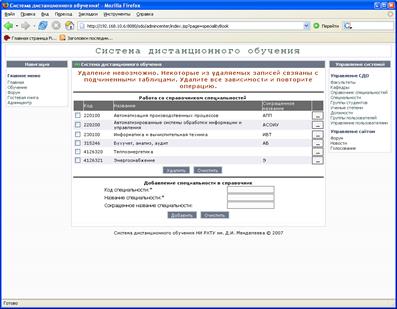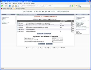 После создания групп администрирующих систему, необходимо приступить к ее администрированию. Рассмотрим процесс заполнения справочников на справочнике специальностей. Для этого выбирается в меню «Управление системой» «Справочник специальностей». В форму добавления вводятся «Код специальности», «Название специальности» и «Сокращенное название специальности». Поля, помеченные звездочкой, обязательны к заполнению. Если данные введены верно и еще не содержатся в таблице, то система подтвердит ввод сообщением (рисунок 2.5.2.3). В случае неправильного ввода, система выдает сообщение об ошибке.