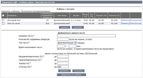 Конструктор учебных курсов позволяет использовать текстовые, графические и мультимедиа материалы для изложения учебного материала. Контроль знаний осуществляется при помощи тестирования. Разработанные пять видов тестов, позволят наиболее гибко осуществить проверку усвоения знаний. Используемая методика задания сложности вопросам, дает наиболее качественную оценку знаний.