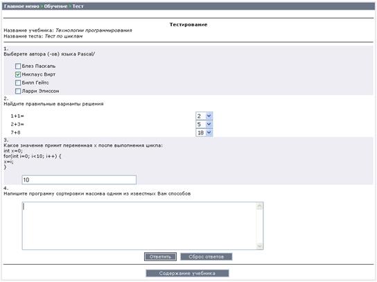 Студенту необходимо выбрать желаемый курс для изучения в данный момент и перейти по ссылке. Перед ним появляется содержание учебного курса, осуществляя переходы по которому, он попадает в разделы электронного учебника. Изучив нужные материалы, студенту предлагается прохождение тестирование. Процесс тестирования показан на рисунке 2.5.4.2.