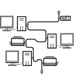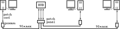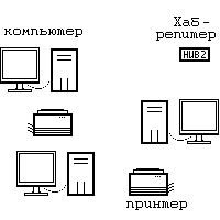 Каждый компьютер (и т.п.) подключен отдельным проводом к отдельному порту устройства, называемого концентратором или повторителем (репитер) или хабом (Hub) .