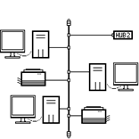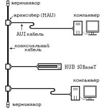 Все компьютеры подключаются к одному кабелю (шине данных). На концах кабеля устанавливаются терминаторы