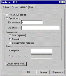 | Выберите пункт "Общий ресурс", сетевым именем станет буква диска или название каталога. Вы можете это изменить как вам нравится, с учетом некоторых ограничений, налагаемых на используемые знаки. Я, обычно, оставляю как есть, чтобы самому потом не путаться. Здесь также можно изменить тип доступа и ограничить все это паролями. Нажимаем "OK" |