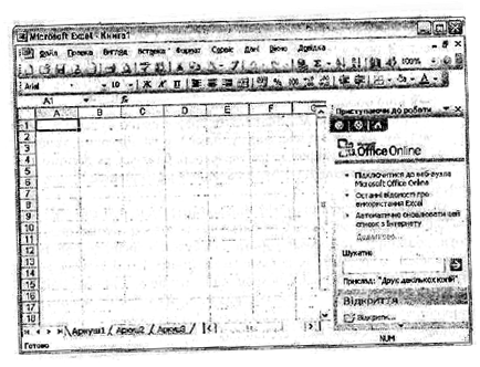 Після запуску програми Excel на екрані з'являється вікно, що називається робочою книгою Книга 1, яка містить декілька робочих аркушів. Кожен аркуш являє собою таблицю, що складається з рядків, стовпців і клітинок. У цих таблицях зберігаються дані, які необхідно обробляти.