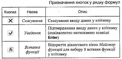 Рядок формул служить для вводу й редагування значень або формул у клітинках чи діаграмах. Excelвиводить у цьому рядку постійне значення або формулу активної клітинки. Для вводу даних слід виділити потрібну клітинку, ввести в рядок формул дані інатиснути кнопку вводу , що знаходиться в рядку формул, або клавішу Enter.