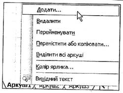 При необхідності доповнення робочої книги новим аркушем слід виконати команду Вставка \ Аркуш, при цьому новий аркуш буде вставлено перед поточним аркушем книги. Для додавання аркуша можна також скористатися контекстним меню (що викликається клацанням правої кнопки миші на імені аркуша), у якому треба вибрати команду Додати. Далі у відкритому діалоговому вікні Вставка потрібно вибрати значок Аркуш і натиснути кнопку ОК.