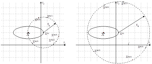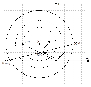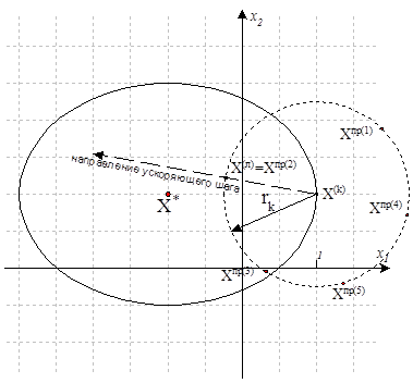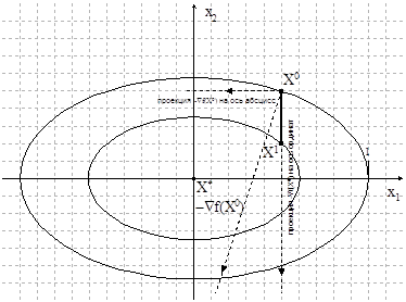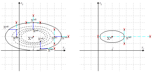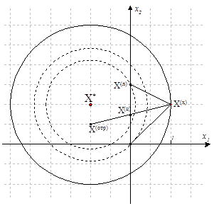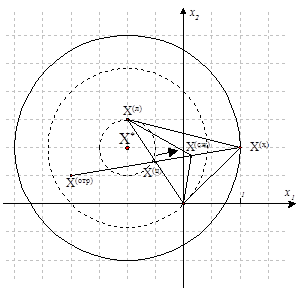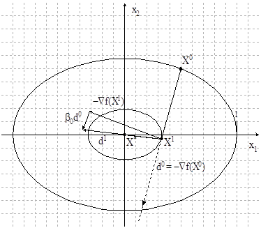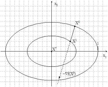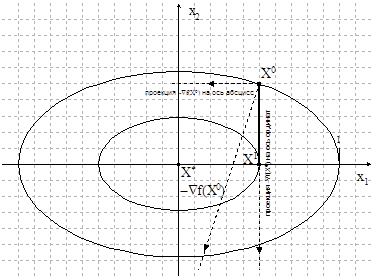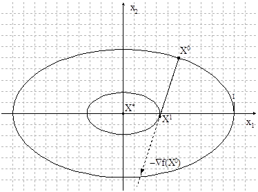 - приемлемое направление перехода из точки в точку – направление спуска. Приемлемым при решении задачи поиска минимума функции будет только то направление, для которого