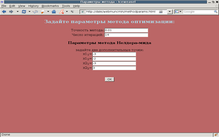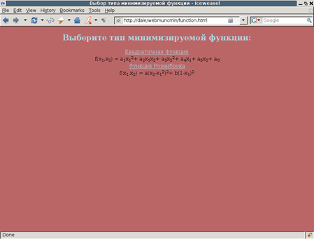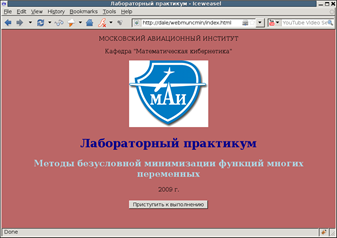 Кафедра «Математическая кибернетика» факультета «Прикладная математика и физика» института читает студентам курс «Методы оптимизации», изучающий методы оптимизации математических функций. На кафедре был создан практикум по этому курсу в среде Microsoft DOS, позволяющий студентам изучать методы на примерах, работая за компьютером в терминальном классе. В рамках дипломного проекта поставлена задача создания аналогичного практикума, работающего в сетевом режиме с целью упростить проведение работ. Также требуется расширить функционал имеющегося практикума для достижения большей наглядности примеров.