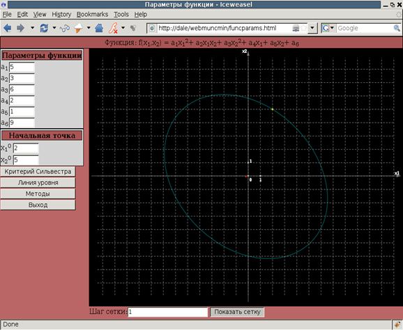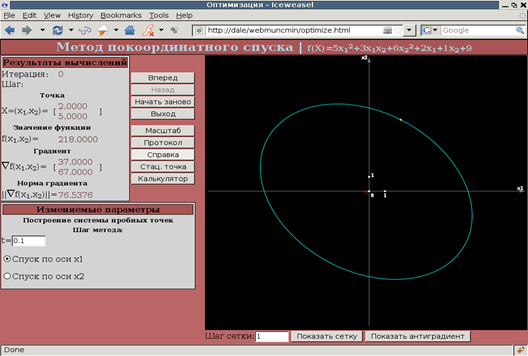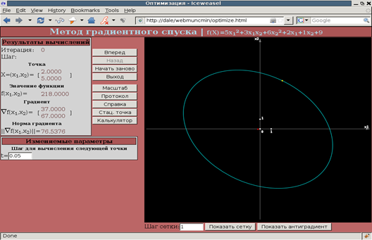 Особенности реализации алгоритма. Вопрос о величине шага на каждой итерации решается пользователем, причем шаг может быть, как уменьшен, если не выполняется условие