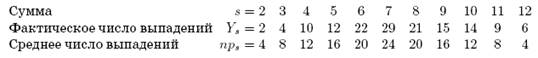 Если бросать кости N раз, можно ожидать, что сумма S появится в среднем nps раз. Например, при 144 бросаниях значение 4 должно появиться около 12~раз. Следующая таблица показывает, какие результаты были в действительности, получены при 144 бросаниях.