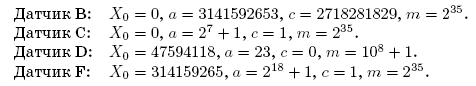 Датчики a, b, d прошли испытания удовлетворительно, датчик c находится на грани и должен быть, по-видимому, забракован, а датчики e и f определенно не прошли испытаний. Датчик~f, безусловно, маломощен; датчики c и d обсуждались в литературе, но у них слишком мало значение a. В датчике d реализован метод вычетов в том виде, в каком он был впервые предложен Лемером в 1948г., а в датчике c-линейный конгруэнтный метод с≠0 также в его первоначальном виде (Ротенберг, 1960).