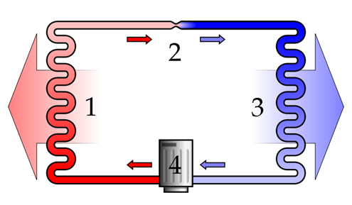 На выходе конденсатора хладагент находится в жидком состоянии, под высоким давлением и с температурой на 10 — 20 °C выше температуры атмосферного (наружного) воздуха. Из конденсатора теплый хладагент попадает в терморегулирующий вентиль (ТРВ), который в простейшем случае представляет собой капилляр (длинную тонкую медную трубку, свитую в спираль). На выходе ТРВ давление и температура хладагента существенно понижаются, часть хладагента при этом может испариться.