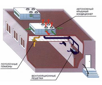 Свежий воздух с улицы через заборную решетку поступает в кондиционеры, где проходит необходимую обработку (фильтрацию, нагрев или охлаждение, при необходимости — смешение с рециркуляционным воздухом) и далее распределяется по помещениям посредством сети воздуховодов.