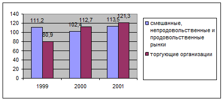 В настоящее время объем розничного товарооборота формируется практически полностью за счет негосударственного сектора (торговые предприятия негосударственных форм собственности, супермаркеты). В 2001 году его оборот достиг 719,2 млрд.тенге (99,5%), тогда как в 1991 году он составлял всего лишь 35,3%.В Казахстане до 1994 года включительно наблюдался спад объемов реализации товаров, в то же время существенно наращивались стоимостные объемы в связи с высоким уровнем инфляции в эти годы. В последующие годы состояние потребительского рынка республики характеризуется достаточно высоким и устойчивым обеспечением товарами, что в определенной мере позволяет сохранять тенденцию роста реальных объемов розничного товарооборота. В последнее время, наряду с торговлей на рынках развивается и торговля в магазинах (супермаркетах), население республики все больше обращается за покупками товаров в магазины (супермаркеты), что обуславливает стабилизацию продажи их торгующими организациями, а соответственно и более высокий рост по сравнению с продажей товаров на рынках (рисунок 1).