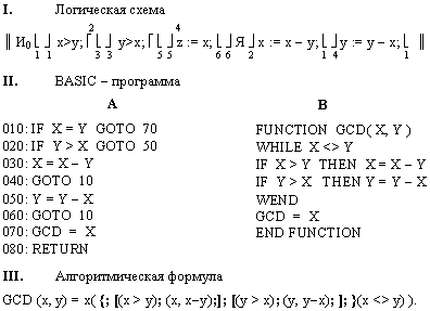 Рис. 1. Алгоритм Евклида нахождения наибольшего общего делителя в представлении различными языками программирования: I – на языке логических схем (Ляпунов, Янов, 1958), II – на одном из наиболее распространенных языков программирования (BASIC) в «старой» (A) и «новой» (B) нотации, III – в виде алгоритмической формулы, адекватной коду формульного процессора