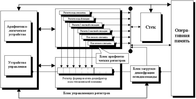 Рис. 2. Возможная функциональная схема формульного процессора Главной идеей, лежащей в основе формульного процессора является включение флагов состояния загрузки регистров местной (внутрипроцессорной) памяти в код выполняемой команды для организации прямого вычисления формульных выражений. Флаги загрузки составляют часть битов регистра формирователя-дешифратора кода команды управления. Другую его часть составляют признаки кода очередной псевдокоманды, представляющей тот или иной символ операторно-формульного кода.