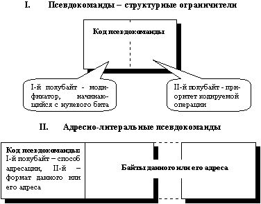 Рис. 3. Структура псевдокоманд формульного процессора Программа-эмулятор формульного процессора представляет собой информационно-логическую модель, реализующую пример системы кодов псевдокоманд и тактовой схемы процессора. Псевдокоманды – структурные ограничители являются однобайтными кодами символов-ограничителей алгоритмических формул (знаки арифметико-логических операций, скобки, знаки-разделители, коды выделенных операторов). Адресно-литеральные псевдокоманды состоят из однобайтного кода-определителя, описывающего формат и способ адресации данного, и самого этого данного либо соответствующей адресной ссылки. В адресной форме они могут задавать начальный адрес как операнда, так и подпрограммы-оператора или подпрограммы-функции. Внутреннее двоичное представление формульного кода напоминает одноадресную систему команд. Каждая отдельная псевдокоманда (элементарная инструкция) отвечает одному символу операторно-формульного кода и состоит из поля-определителя, содержащего код-определитель, подобный коду операции, и, возможно, единственного поля операнда (рис.3). Псевдокоманды подразделяются на адресно-литеральные и структурные ограничители, не содержащие поля операнда. Структурные ограничители выполняют роль символов-ограничителей (знаки операций, скобки, знаки-разделители, привилегированные операторы), а адресно-литеральные псевдокоманды соответствуют константам, переменным либо именам операторов и функций, т.е. составляют код оператора или функции. При этом поле операнда адресно-литеральной псевдокоманды может содержать непосредственно операнд арифметико-логической операции, либо адресную ссылку того или иного вида на такой операнд или на подпрограмму, отвечающую оператору или функции. В этих псевдокомандах поле-определитель задает формат операнда и способ его адресации. Пример возможной системы команд формульного процессора и тактовой схемы их выполнения был протестирован на реализуемость в программе-эмуляторе (табл.2 представляет часть соответствующей кодовой таблицы). Таблица 2 Структурные ограничители