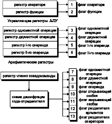 В начальной фазе отработки очередного оператора РАУ находится в нулевом состоянии, а счетчик команд указывает на код текущей псевдокоманды, которая, при правильности формальной структуры программы, должна содержать код оператора. Выполнение этой «нулевой» (табл.3, первая строка) команды процессора состоит в переписывании кода оператора в регистр оператора, в силу чего соответственно переустанавливается флаг состояния его загрузки. Выборка последующей псевдокоманды завершает формирование новой команды управления. При загруженном регистре оператора процессор находится в режиме создания списка аргументов этого оператора. Этот режим завершается отработкой псевдокоманды, содержащей код разделителя операторов (флаг 13 на рис.4). К конечной фазе этой отработки в стеке (либо особо выделенных регистрах местной памяти) должны сформироваться адресно-литеральные псевдокоманды, представляющие вычисленные значения аргументов оператора, после чего инициируется выполнение данного оператора. При создании списка аргументов оператора процессор реализует вычисление соответствующих формульных выражений. Эти действия вытекают из логики обычного вычисления формулы и составляют наибольшее функциональное отличие формульного процессора от командного.