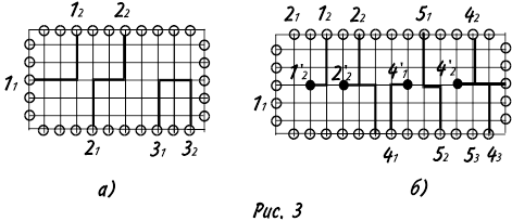 На рис.1в ОТ2 представляет собой развернутое на 90° ОТ1 на рис.1а. Каждая цепь представляется в виде связного набора вертикальных и горизонтальных фрагментов. Не допускаются наложения друг на друга вертикальных и горизонтальных фрагментов, принадлежащих различным цепям, не допускается их пересечение в совместном эскизе топологии. Каждая цепь разбивается на двухтерминальные соединения (ДС). В простейшем случае разбиение на ДС осуществляется при последовательном просмотре столбцов сетки слева направо, начиная с крайнего слева столбца. На рис.1 цепь 1 подходит к терминалам (11 ,12 ,13 ), цепь 2 к (21 ,22 ,23 ), цепь 3 к (31 ,32 ,33 ), цепь 4 к (41 ,42 ), цепь 5 к (51 ,52 ). На рис.1 цепь 1 разбивается на ДС11=(11 ,12 ) и ДС12=(11 ,13 ), цепь 2 на ДС21=(21 ,22 ) и ДС22=(22 ,23 ), цепь 3 на ДС31=(31 ,32 ) и ДС32=(32 ,33 ).