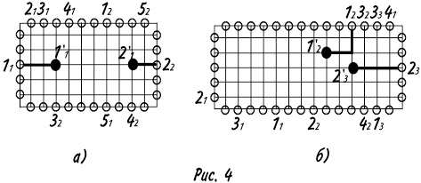 На рис.4а проведены горизонтальные фрагменты от терминалов 11 до 1¢1 и от 21 до 2¢2 . В дальнейшем ДС1 и ДС2 трансформируются, т.е. они будут инцидентны терминалам 1¢1 и 2¢2 соответственно. Перед резервацией анализируется состояние столбцов и если необходимо и существует возможность формируется ближайший к терминалу свободный столбец.