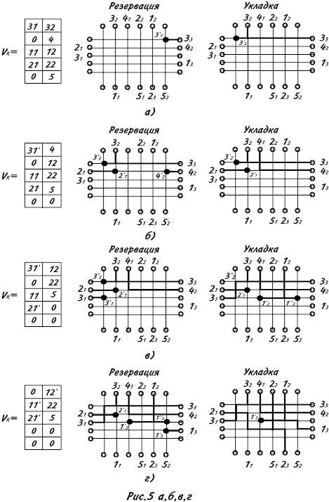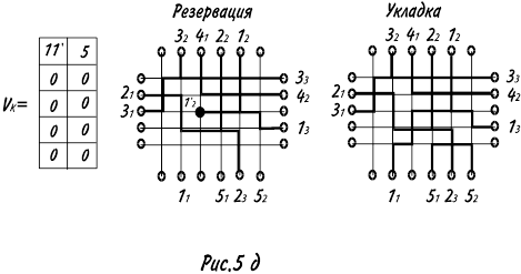 Затем просматривается матрица Vk . ДС31¢ не помещается, ДС4¢ помещается полностью и удаляется из Vk , которое потом сжимается. На рис.5в,г,д, показан процесс укладки 3, 4, и 5-й магистралей.