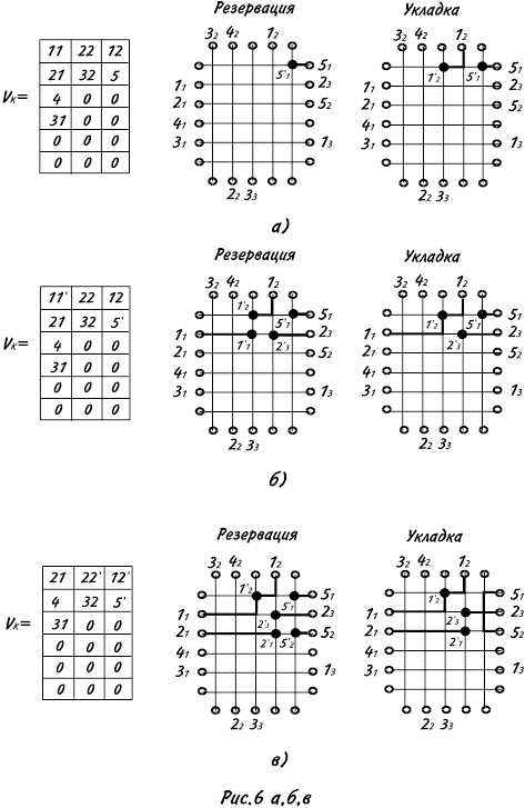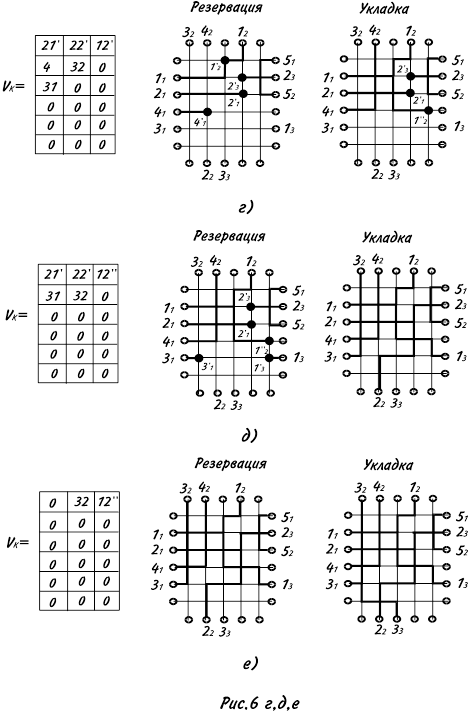 При заполнении 5-й магистрали (рис.6д) резервируются терминалы 31 .и 13 . ДС31=(31 ,32 ) трансформируется в ДС31¢=(3¢1 ,32 ), а ДС12¢¢=(1¢¢2 ,13 ) в ДС12¢¢¢=(1¢¢2 ,1¢3 ). При просмотре Vk полностью помещаются ДС21¢, ДС22¢, ДС31¢, ДС12¢¢, которые удаляются из Vk .