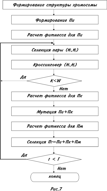 Заключительной операцией в пределах одного поколения является селекция расширенной популяции Пт=Пи+Пк+Пм. В результате селекции на основе ²принципа рулетки² отбирается новая популяция Пи лучших решений, которая является исходной для следующей генерации. Число генераций (поколений) Т, размер популяции М и параметры Рк и Рм являются управляющими параметрами, влияющими на эффективность процесса генетического поиска.